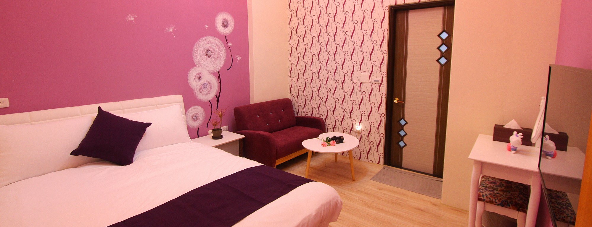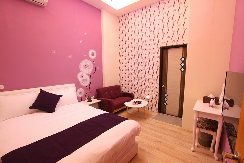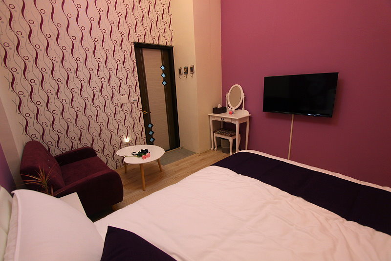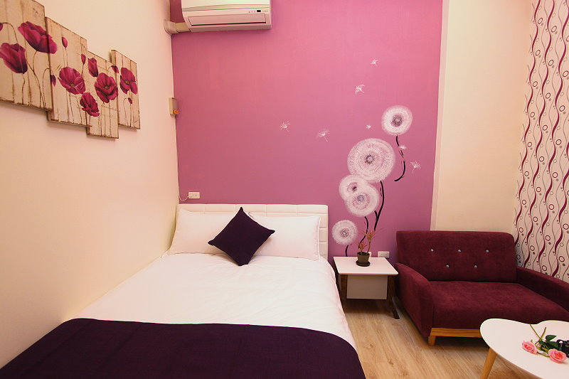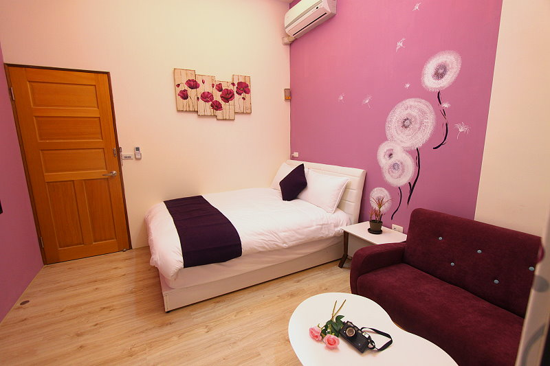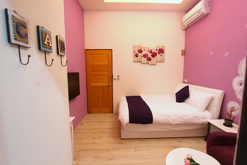 香草紫雙人房guestroom 房型價格 平日:NT$1350 假日:NT$1550(星期六及連續假期) 定價:NT$2700 加床價:平日NT$300/人、過年NT$500/人 住宿人數:2人 包棟價格 平日:NT$8000 假日:NT$9500(星期六及連續假期) 客房設備 液晶電視,中華電信MOD,wifi,日立分離冷暖氣,乾濕分離衛浴設備,冰箱,衣架,沙發,吹風機,礦泉水,茶包,咖啡包,浴巾,盥洗用品,小陽台,無線上網(需自備電腦) 公共設施 冰箱 免費停車場